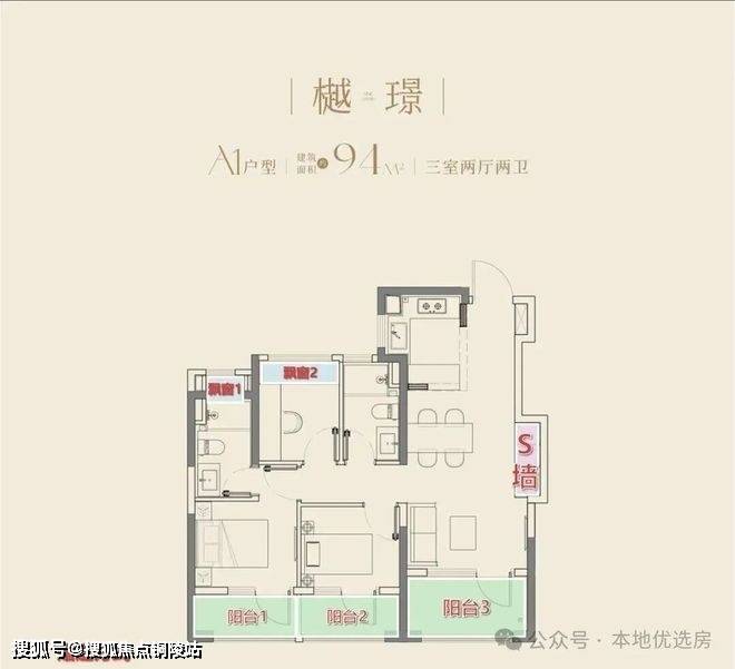 约94㎡起步户型:设计了市场上不多见的南向三阳台,凭借充足(约9%)的赠送面积,实现空间利用率最大化。