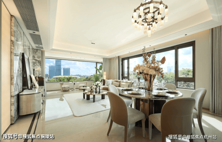 客餐尺度达约7.5米面宽,270°极致环幕窗景,实现了三面采光,无论在客厅、餐厅还是书房,葱郁园景皆如流动画卷,成为空间的主角。