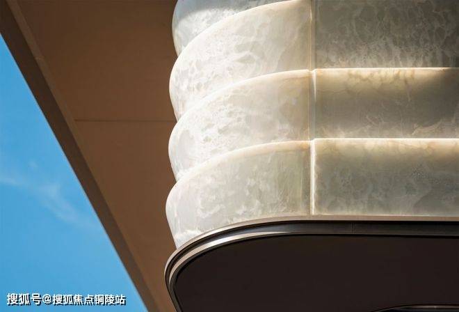 西侧主入口以三组晶莹玉构筑主体,通过中间高、两边低的布局,营造出秩序与礼仪之美。横向编织的玉石叠级轮廓,如同透亮的灯笼骨架,亦如轻盈的东方垂帘。这温润的材质,被巧妙雕琢为天地的隐喻,静默述说着东方文化的内敛之美。搜建筑