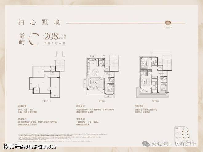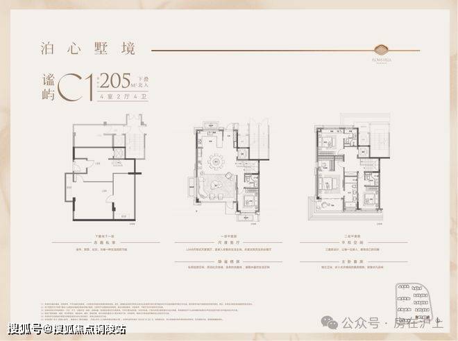 户型特点:下叠边套,南向面宽约9米,客餐厅同宽约5.8米,空间开阔。一楼设南向卧室,采光好且视野佳。二楼为三套房+主卧总统套房设计,主卫南向,可容纳浴缸和双台盆。地下室方正,附赠采光井,利用率高。