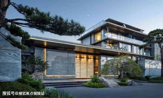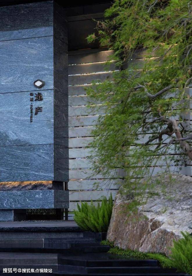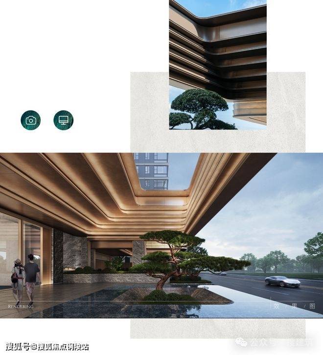南大门以现代宋式美学为笔,库班灰石材镌凹槽光影,两侧沉稳如砚,温润玉石屏风透光藏景,轻钢飞檐承宋韵,悬挑一抹空灵。前庭孤树与奇石对望,转身水景铺陈,享影横波,归家动线于隐奢中完成由“雅境”至“松弛”的东方转场。搜建筑