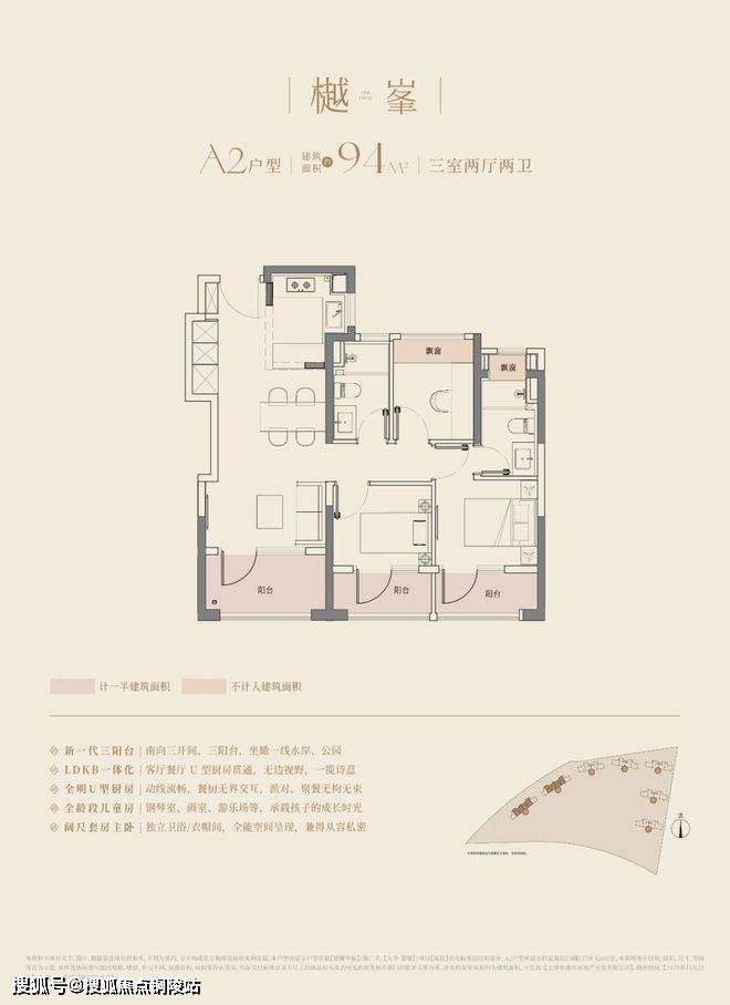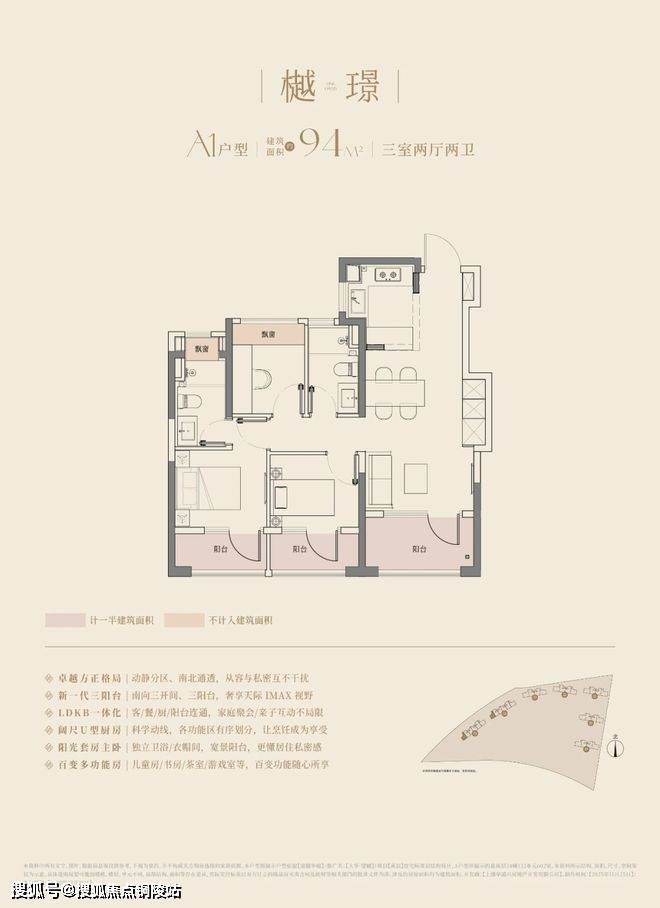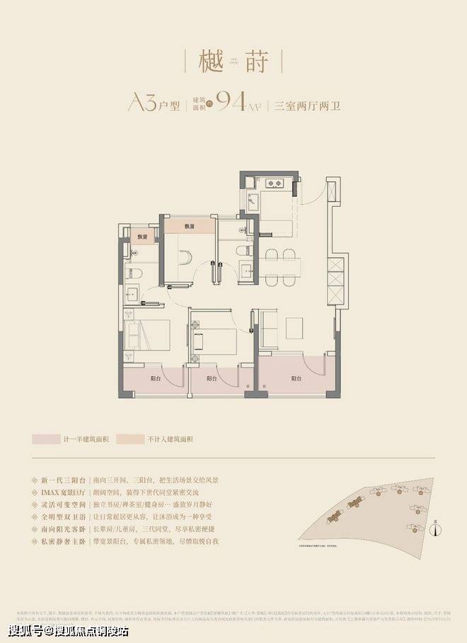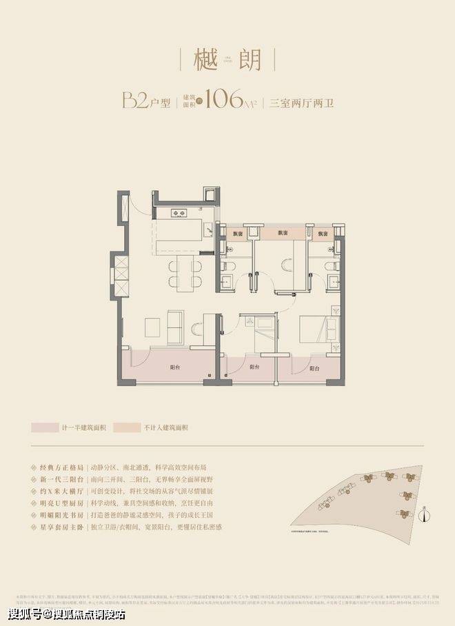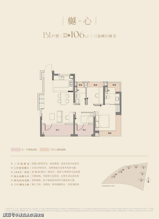建面约106㎡的三房两厅两卫,3.5开间朝南,南向面宽达到约11.8m!碾压市面上以前的三开间朝南、10米面宽的三房户型。