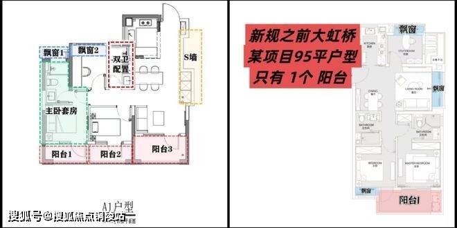 在这里,高层建面约94㎡户型做到了惊人的三阳台,对比同板块内以前的标杆小区,同面积段户型只做了1个阳台。不仅数量发生质的变化,实得面积也大大增加。