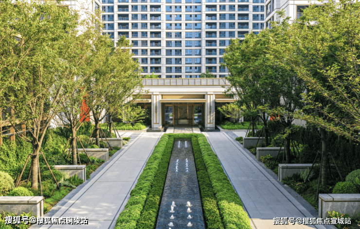 入口中轴对称式的前厅水景,两侧阵列由榉树围合组成,不仅拥有“门前中举”的美好寓意,也让入口的仪式感拉满,与灵动的喷泉水景交相辉映,形成具有东方礼序的归家体验。