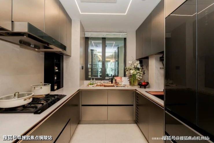 以143户型为例,全屋配备日立中央空调。厨房集成了嘉格纳油烟机、三眼灶台,并搭载博世洗碗机、嵌入式冰箱,以及A.O.史密斯零冷水热水器,高效便捷。