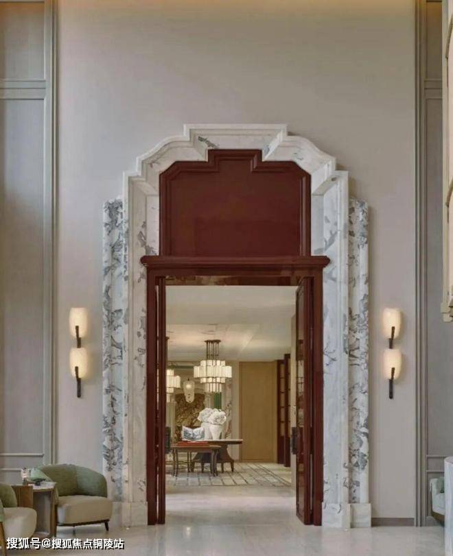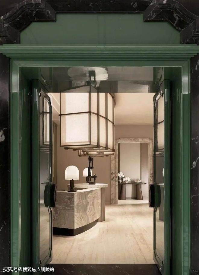 石材两侧,两扇深邃而富有生机的绿色门扇跃然而出。这抹“绿”,绝非随意之选——它呼应东方山水画中的“青绿”,是自然生机的隐喻,亦是空间活力的点睛之笔,与石材的沉稳形成静谧与生机的第一重对话。