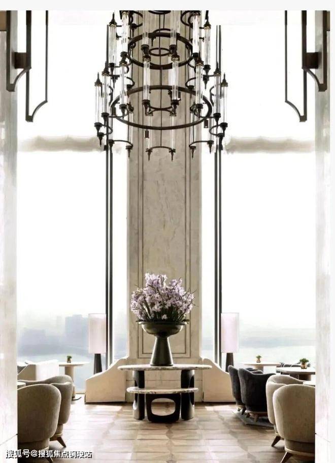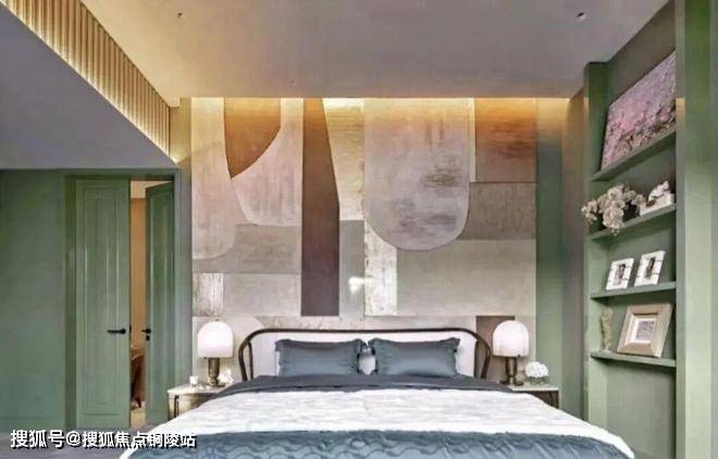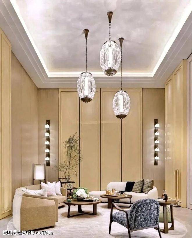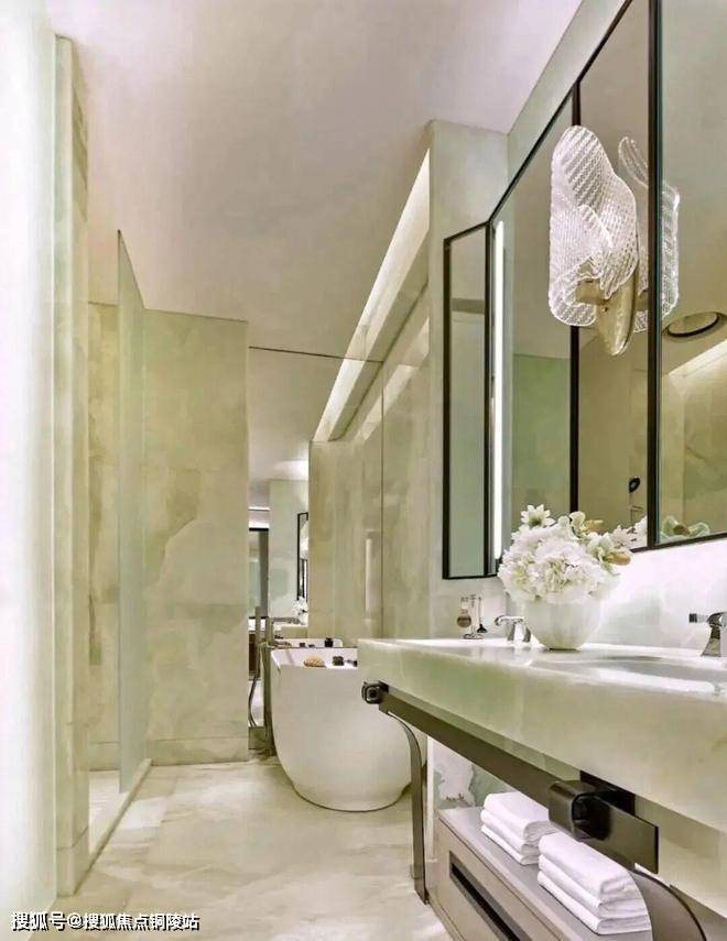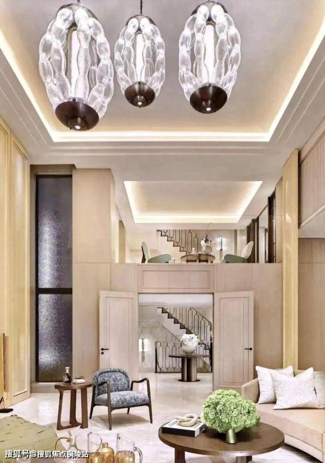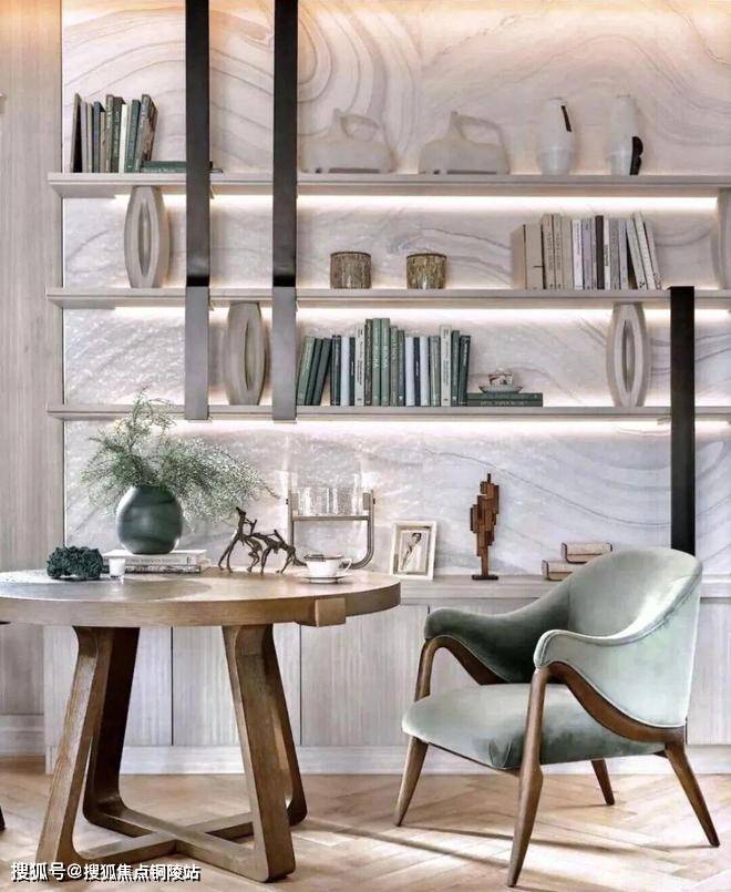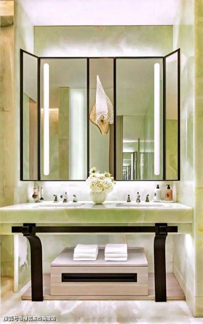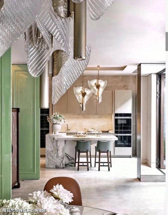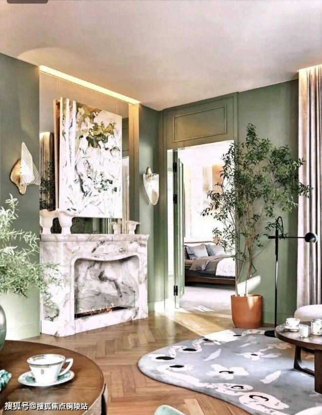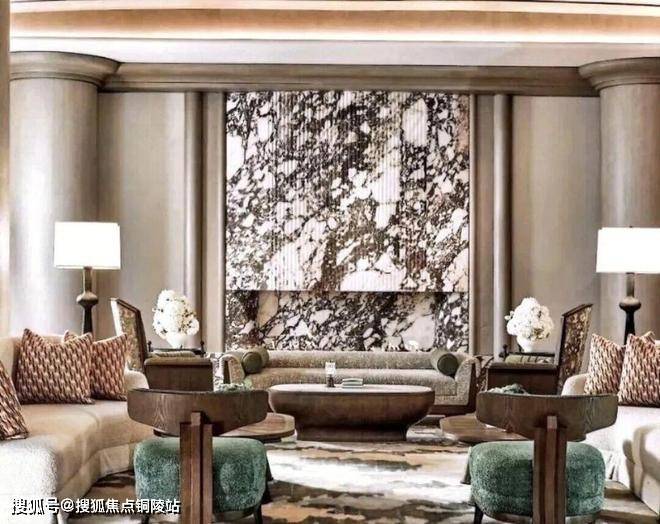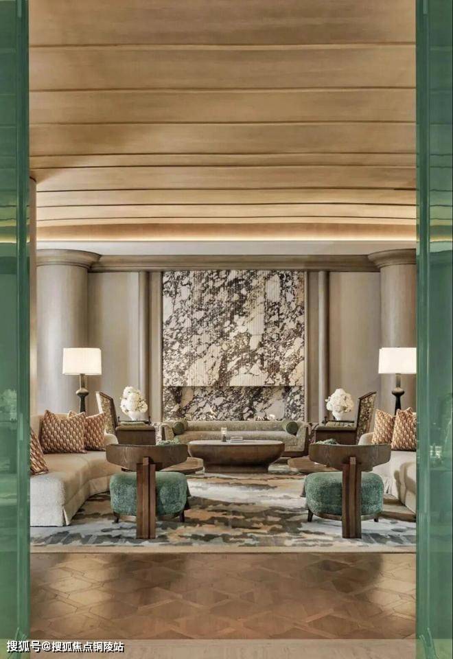 顶层下午茶区以淡绿为底,壁炉暖光漫过手绘地毯的肌理,将社交场域沉淀为冥想容器;主人房墙面缟玛瑙(Onyx)的天然流痕,也与一层屏风暗纹形成时空对位,光影在矿物晶体中生长出私密的诗。