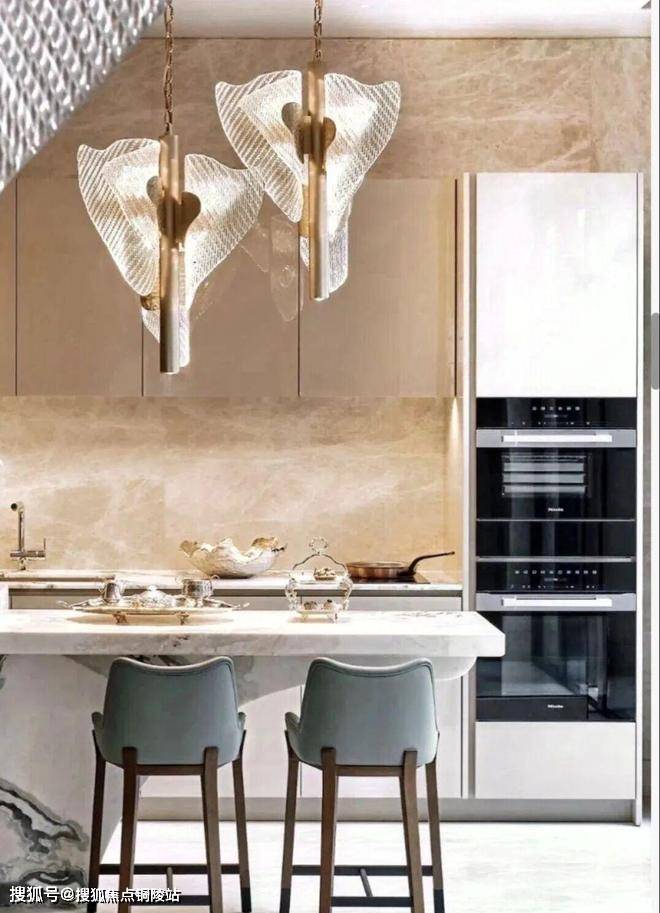 主厅核心区悬浮式定制柜体,银箔与丝绸在几何切割中构建中式基因,毕加索石材的天然裂变肌理成为天然艺术装置。瀑布吊灯以流体力学演绎东方留白,让光影在岩板表面生长出动态水墨意境。