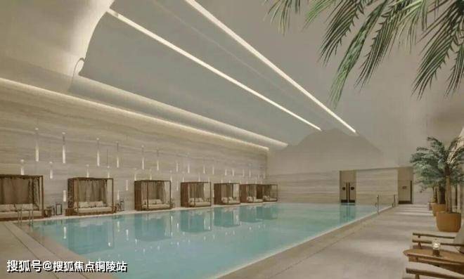 会所内的泳池上方做流畅且立体的吊顶线条,造型现代且富有层次感。这样的设计不仅提升了空间的视觉效果,更营造出一种轻松、悠闲的度假氛围。