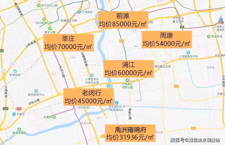 在前滩辐射圈内,目前前滩版块均价约8.5W/㎡、周康版块均价约5.5W/㎡、浦江版块均价约6.0W/㎡、莘庄版块均价约7.0W/㎡左右、而金汇版块目前均价才约3.3W/㎡,属于正真的价值洼地。