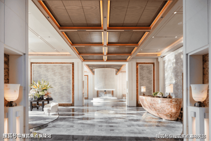 再往里走就是迎宾区,整个公区部分由世界顶级的奢华酒店设计专家CCD负责设计,4.5米的层高直接打造出了顶奢酒店的质感。
