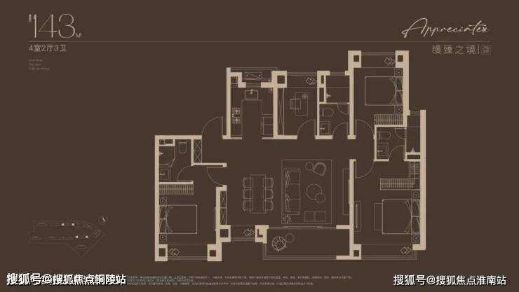 143㎡四房:7米横厅 + 双套房设计,中西双厨预留位,北向次卧可定制薄款衣柜优化空间