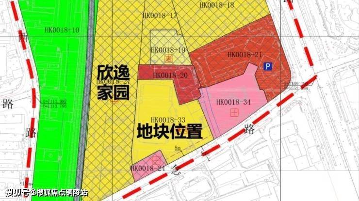 HK0018-33地块位于纪念路北侧,靠近逸仙高架路;地块形状不算规整,东侧紧邻HK0018-34地块,规划为社区医疗卫生用地;西侧是保留的现有住宅,欣逸家园。