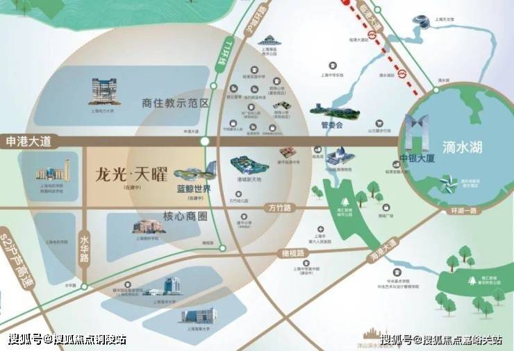 【龙光·天曜】就位于商住教示范区的门户核心位置,从上海市区自驾来临港,经S2沪芦高速(已全程免费)下闸道进入申港大道,首先映入眼帘的就会是滴水湖首个天际坐标——龙光蓝鲸世界百米酒店。这个酒店也是【龙光天曜】建面约50万方综合住区的商业配套部分。