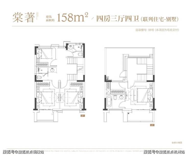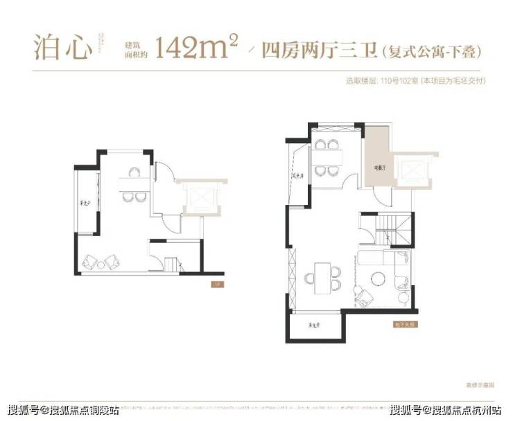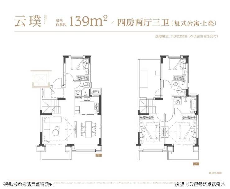 4层叠墅分为上/下叠,上叠建筑面积约139㎡,下叠建筑面积约142㎡,均为4房设计。
