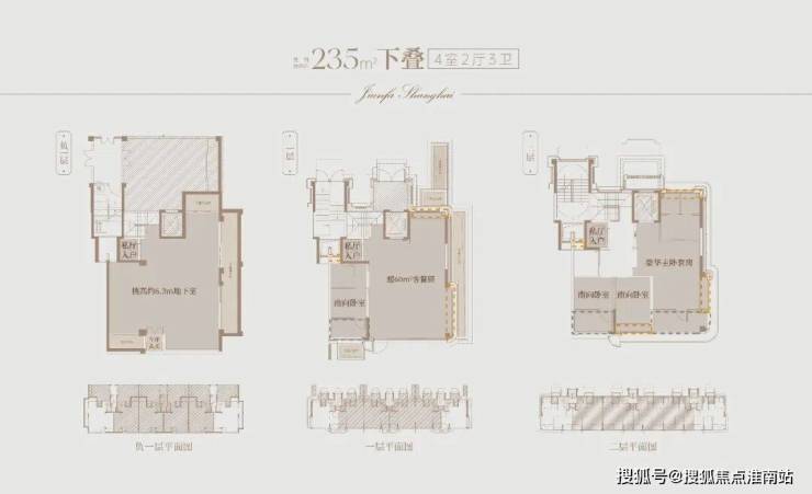 建面约228㎡下叠户型,以奢阔尺度与灵动格局,诠释世家大宅的气度与品位。首层南向建面约110㎡私家花园(边厅),可设置户外沙发、烧烤台与篝火区,营造星空下的会客厅;二层主打舒适卧室层,三间卧室均拥有宽绰尺度;地下空间更显匠心,约6.3米的挑高可轻松拓展为双层使用,轻松延展建面超200㎡的灵动多功能区。