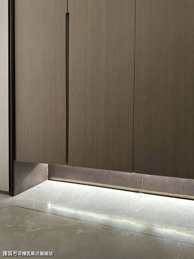 鞋柜下方做了悬浮处理,同样也是内嵌灯带,这里灯光的角度还会再调整,因为灯光映射在大理石地面上!