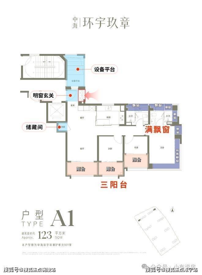 以建面约123㎡3房为例,区别市面上多数仅单或双阳台布局,该户型四面宽朝南+罕见的南向三阳台,实用性和采光度更强。