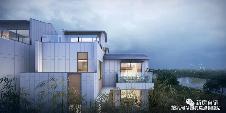东滩云墅采用现代中式简约建筑风格,主要立面材料选择米白色真石漆,局部铝板及铝合金线条点缀建筑立面,立面简洁统一,强调横向线条,大气典雅。