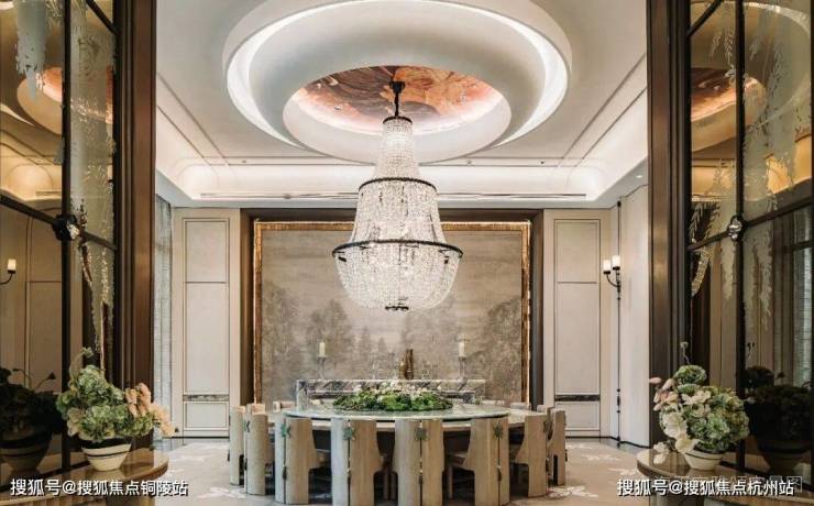 在景观落地窗环绕中,私宴厅以“花廊序列,美学对景”构筑专属的私谧空间,巨型水晶吊灯与浅色饰面的搭配,色彩质感上相得益彰,营造融合艺术、文化与生活美学的奢享感场域,成就令人神往的优雅社交范式。