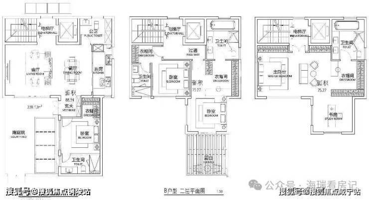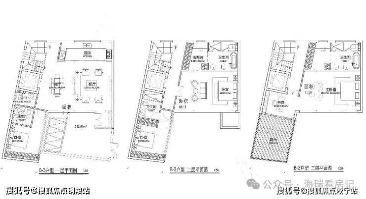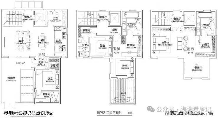 二楼双套房设计,三楼主人套房设计,开放式书房空间,通往露台。