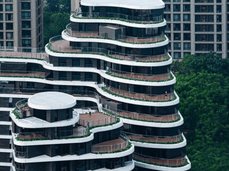 外立面采用玻璃幕墙现代简约风。建筑轮廓曲线蜿蜒,呈波浪线型层层迭高并后退,时尚感非常强。