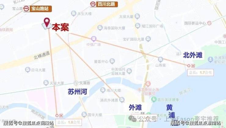 仅从图上看,该地块直线距苏州河约1公里,直线距外滩约1.4公里,直线距北外滩约1.7公里,直线距3/4号线宝山路站约300米,直线距10号线四川北路站约560米,区位优势明显。