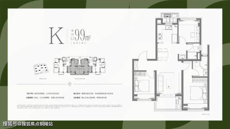 实现了大面宽横厅的飞机户型设计,使得南向的开间,全部布置为客厅、主卧和次卧三个最重要的功能区;北向房间则布置了次要的厨房、次卫、书房和主卫功能,最优化的提供南向面宽和缩窄户型整体进深,提升户型整体的采光和通风。