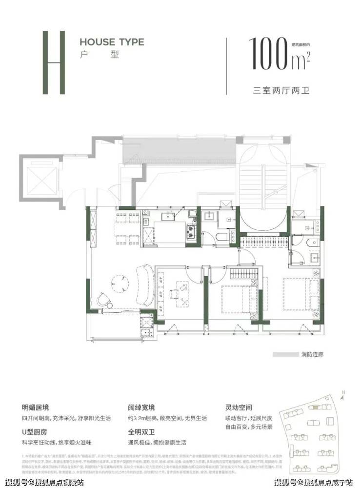 建面约100㎡H户型▼