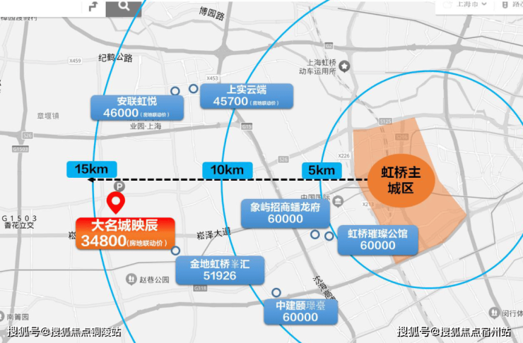 将视野拉大,在青浦,向东赵巷皆5万+/㎡,向西青浦新城、淀山湖大道也都4.5万+/㎡。