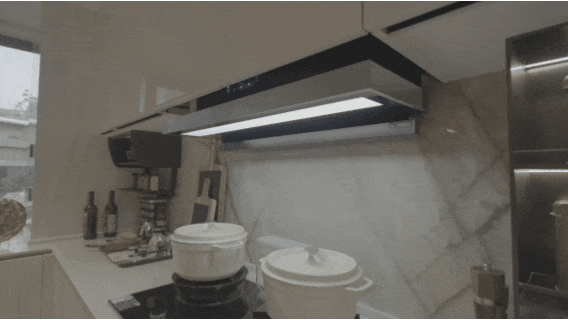 自动升降的隐藏式油烟机,挥一挥手就能开启,低吸设计牢牢锁住油烟不扩散;烟灶联动、制冷空调、蒸烤同烹等功能,适配多样烹饪场景。