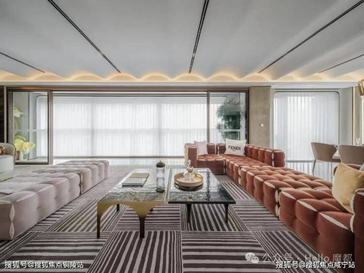 温暖舒适的面料造就了空间温情的一幕,金属是这个空间的常见材质,在现代都市中代表着冷峻的表面,而在家庭厅,绿植、曲线、面料中则描绘了生活小家的场景,在光线的映射下,更显得温情融容,实现了空间与人的情感链接。