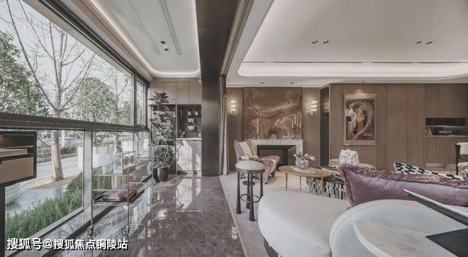 首先是奢石含量极高,从入户处的玲珑玉拼花与透光云石辉映,到翡翠绿奢石墙景、再到 发光云石装饰点亮归家路,石材的典雅贯穿始终。