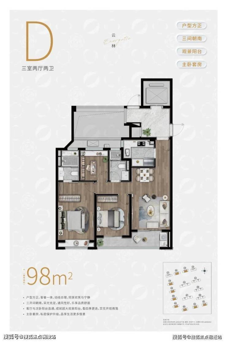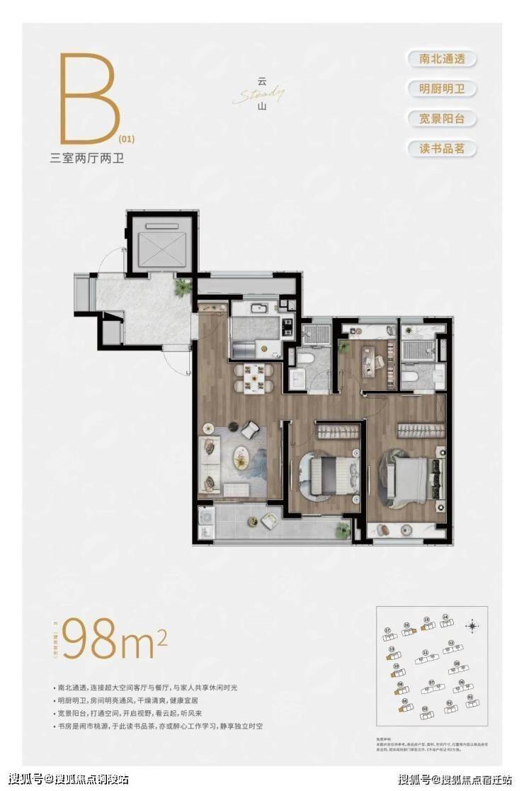 约98㎡3房2卫户型,三开间朝南,并且这贯穿客厅+次卧的超大阳台实在是惹眼,这个南向的视野延展度以及采光度相比同级别的户型来说,要更加出色.
