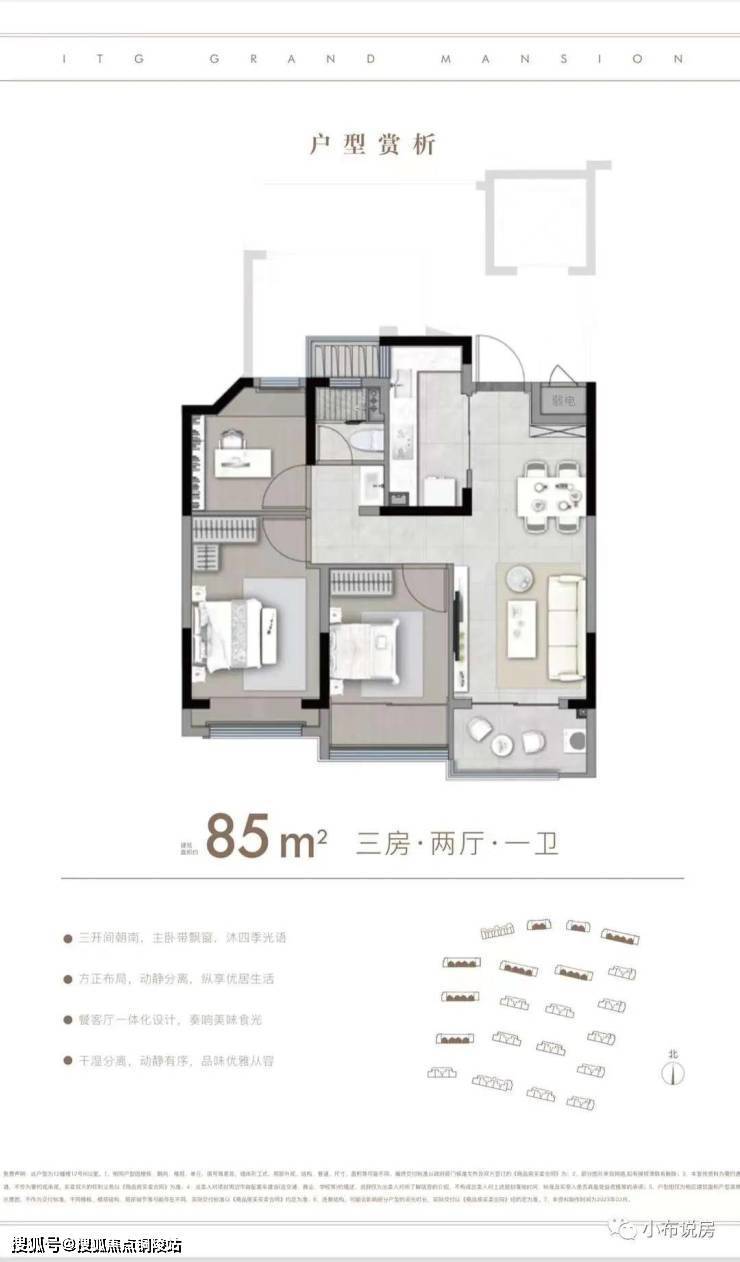 户型解析:约85㎡的3房,这种入门级的产品也要保证居住的尺度感。比如利用L形厨房与餐厅相连接,一体化的设计让空间充足利用。比如次卧连接阳台,就是人性化考虑到给他们一个私密的追光天地。