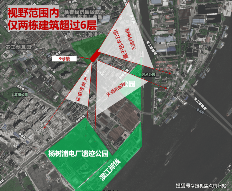 保利誉滨江踞于杨浦滨江亲江位置,距黄浦江岸仅约500米(数据来源于百度地图直线测距)。而8号楼,更位于整个社区的南侧,靠近黄浦江,南侧无高层楼栋,整体视野非常开阔,从复兴岛到黄浦江视野,几乎无遮挡。