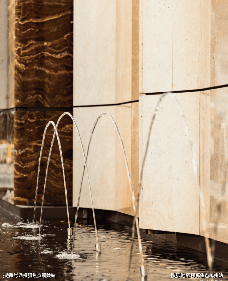 在门庭外,辅以两侧具有仪式感的跳泉水景,将建筑的圆弧美感与自然水景相合,共同构成海上·清和玺“贵雅清和”的城市界面。