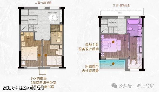 2F则是更自由的2+X的格局,2间南向阳光卧室搭配北侧多功能书房,既可保持独立分区,又能打通改造为带衣帽间、休闲区的豪华套房。