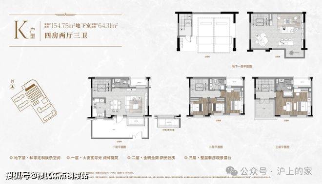 一楼和地下室主社交和志趣,二楼是子女的房间,三楼是主人休憩区。
