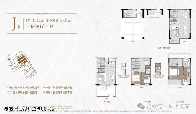 约130㎡的主力户型:地上3层,其中地下附赠55㎡左右,超高空间附赠,整体户型相对方正,面宽约5.6米,进深约7.8米;