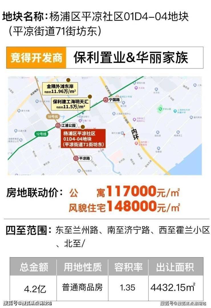2023年12月5日,杨浦区平凉社区01D4-04地块(平凉街道71街坊东)以底价出让,华丽家族和保利置业联手拿下。该地块容积率1.35,高层联动价11.7万/㎡,风貌别墅联动价14.8万/㎡。