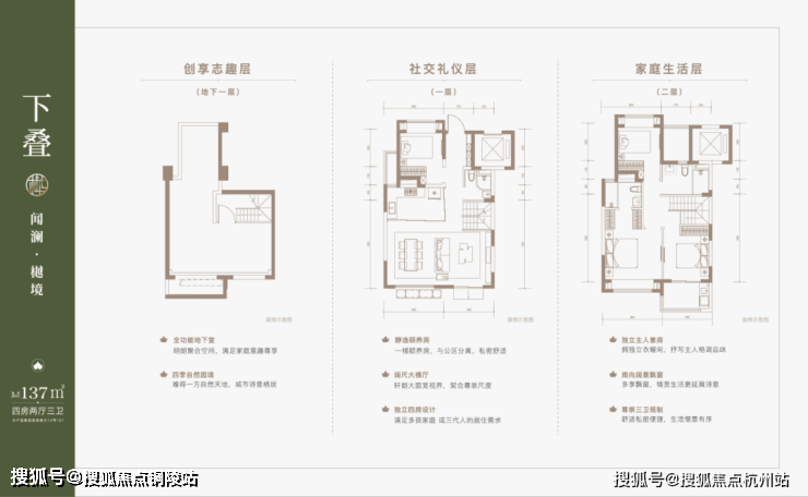 建面约 137 ㎡下叠, 四房两厅三卫 全能格局,非常适合二娃家庭以及三代同堂。