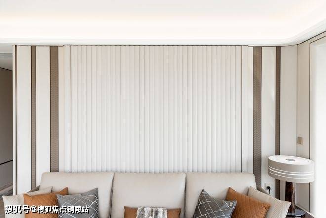 客厅的背景墙用了多重弧度曲面来表达,并巧妙将金属面板嵌入皮革接缝,打破传统空间方正刻板的印象,带来灵动且富有变化的视觉体验,从细节处折射出摩登生活的精致态度。