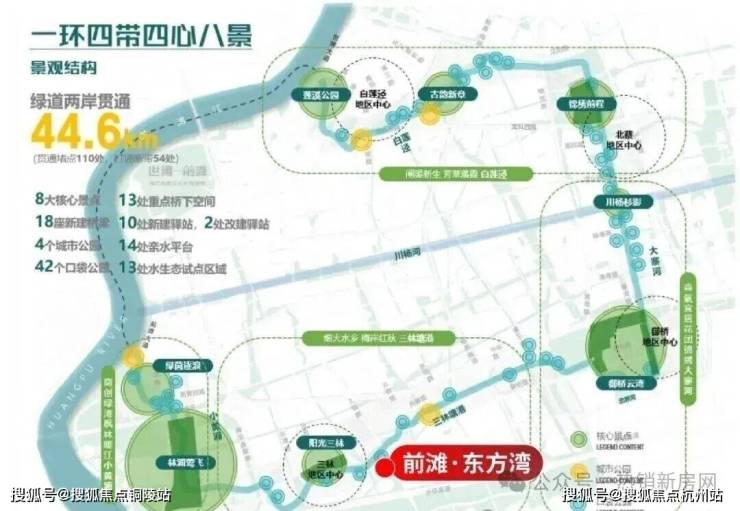 周边前滩友城公园、前滩体育公园、东明公园等已建成公园,三林塘港、“林浦莺飞”、“绿茵逐浪”等核心景点将连缀成片,形成气势磅礴的滨水公园带。