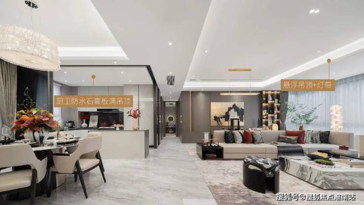 四合一风暖浴霸、厨房嵌入式凉霸,节省空间的同时尽享舒适;厨卫防水石膏板满吊顶、一圈叠级吊顶+灯带、悬浮吊顶+灯带、窗帘盒灯带,不仅美观,也实现均匀舒适的线性照明效果,让居室尽显宽敞明亮。