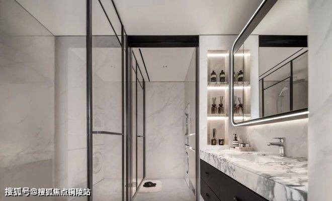 ✔卫生间地面和墙面整体性也非常强,奢石台面的纹路和岩板墙面和协调。