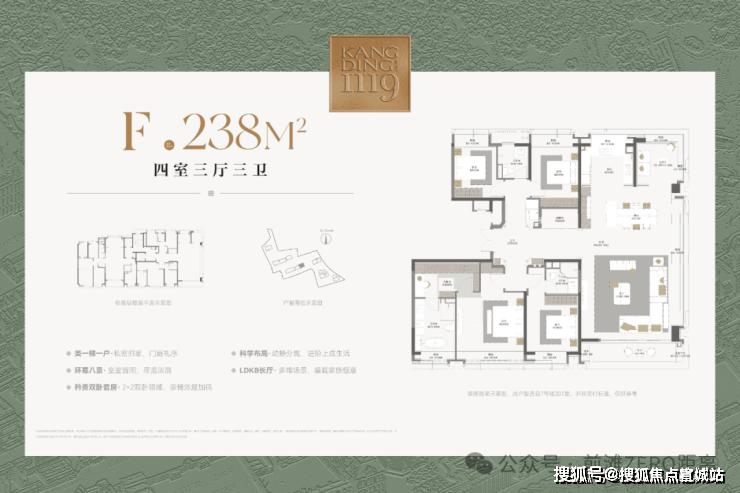 约17.2米环绕观景台:约238㎡户型的客餐厅,位于户型的顶端。自东向南环绕270度的观景台长达约17.2米,在这样的客厅,甚至可以踱步欣赏窗外的满眼梧桐。独立会客厅,可以做小茶室或棋牌,更深一步的隐私感,为专享客群定制。