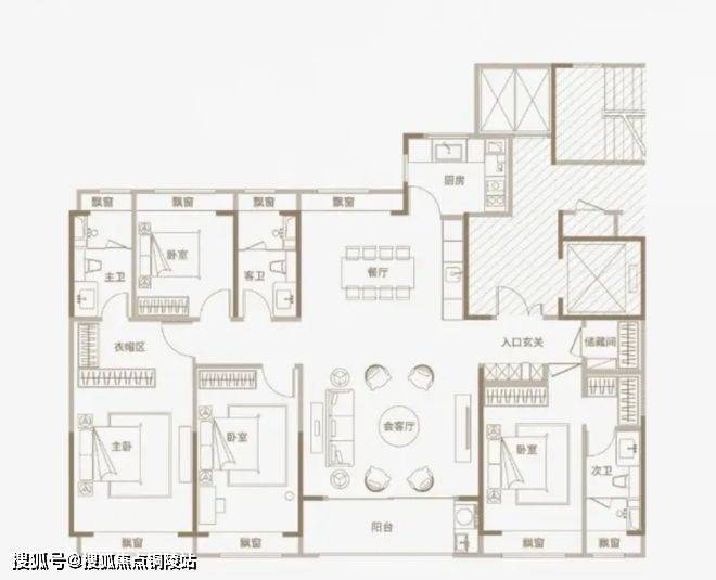 要知道,现在市面上的主流做法,是把三房的各个功能空间,都做飘窗设计,以得到更开阔的景观视野,并增加实际面积使用率。