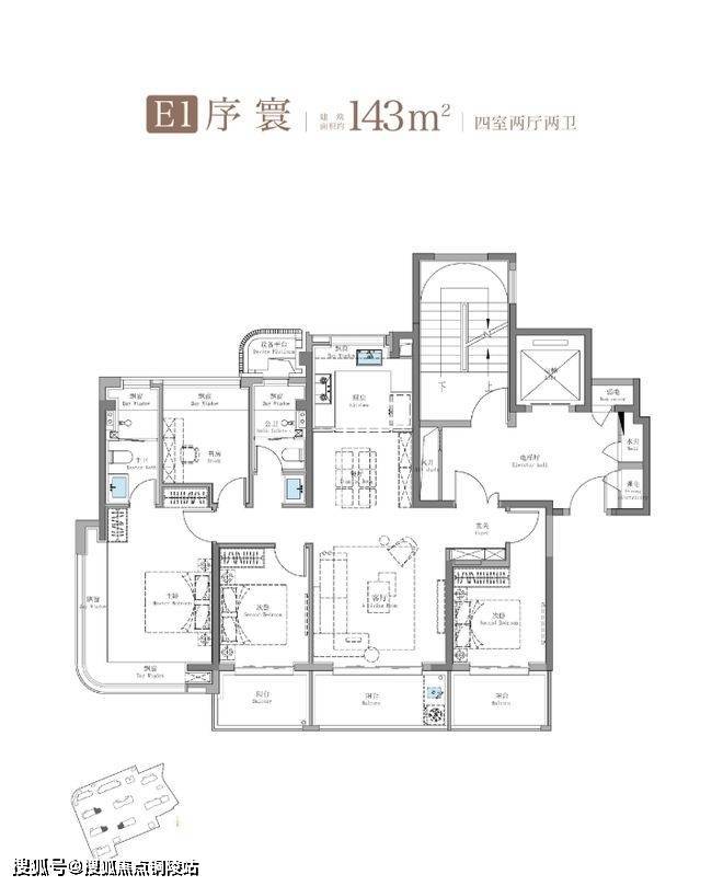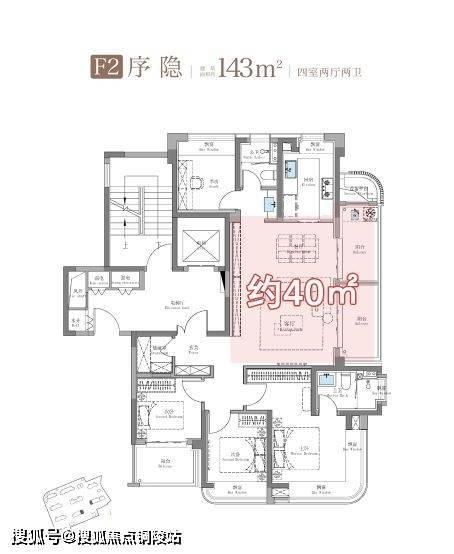 建面约143㎡还有一个侧厅户型,如果将客餐厅和双阳台打通之后,业主将获得一个约40㎡的起居空间!