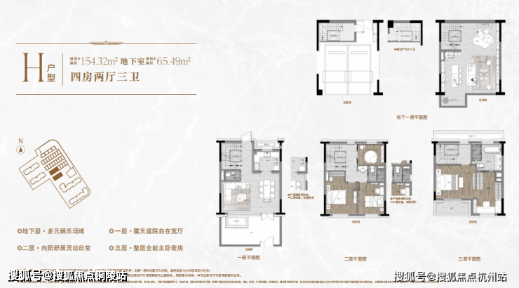 一楼和地下室主社交和志趣,二楼是子女的房间,三楼是主人休憩区。